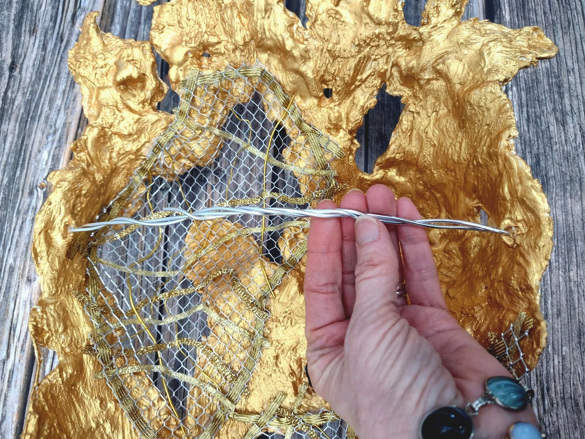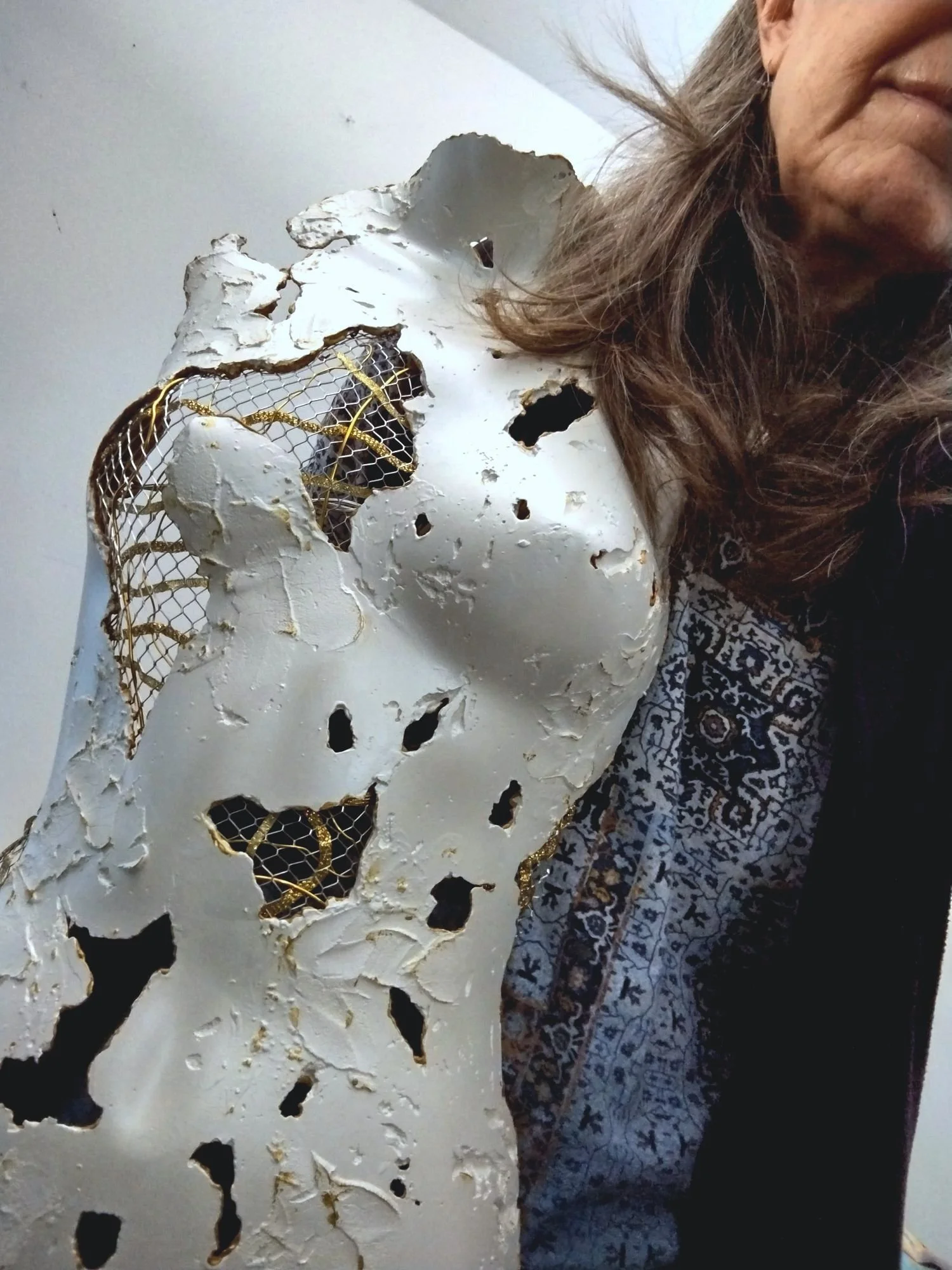 In the throes of creation, a transformation occurred. What emerged was a woman adorned with scars and fissures, yet imbued with a resilience that belied her fragile appearance. As I worked, layering the back with radiant gold and reinforcing the most vulnerable areas with wire and gold ribbon, I witnessed a shift from fragility to strength.